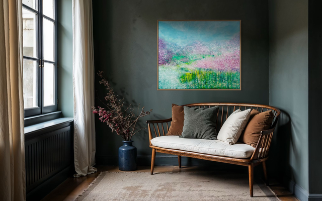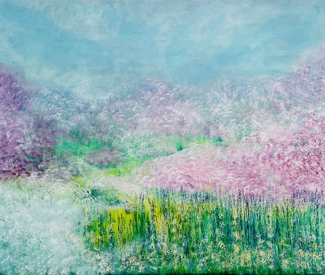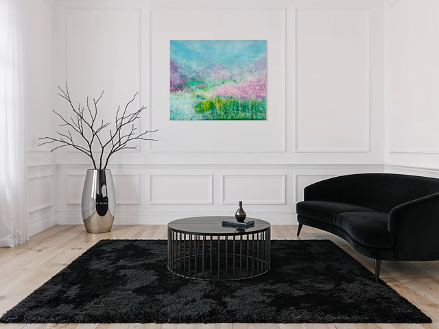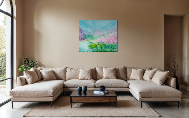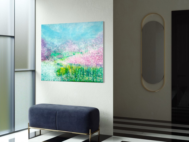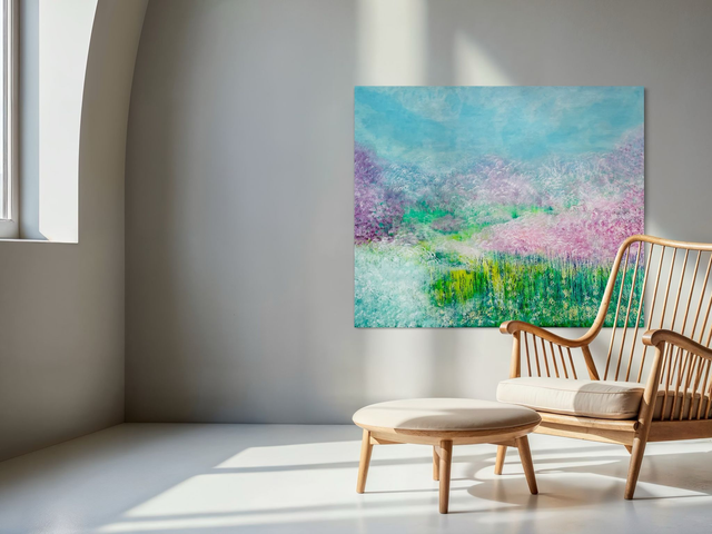 Ein großformatiges Unikat (100x120 cm) der intuitiven Abstraktion von LadyMARIANN-Arts. Dieses Acrylgemälde fängt die lyrische Schwerelosigkeit des Frühlings ein. Die Komposition vereint zarte Magenta- und Violetttöne in Blütenwolken mit lebhaftem Limettengrün und dem himmlischen Türkis des Horizonts. Ein visuell beruhigendes Original und zugleich energetisches Statement Piece. Eleganz und Ruhe für Ihre Wohnräume.