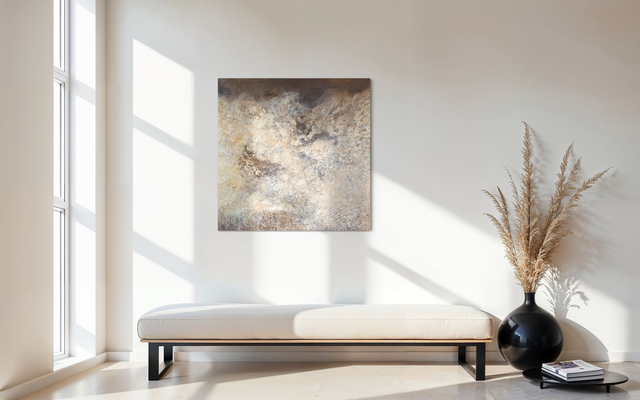 "Nebelstein" - ein fesselndes abstraktes Gemälde der haptischen Abstraktion. Dieses 100x100 cm große Kunstwerk fasziniert durch seine massive, organische Faktur in beruhigenden Neutraltönen. Der "Nebelstein" fängt die Dualität von flüchtiger Emotion und geologischer Stabilität ein. Perfekt als Statement-Piece für minimalistische oder Japandi-Interieurs. Einzigartig. Fühlbar. Unverwechselbar.