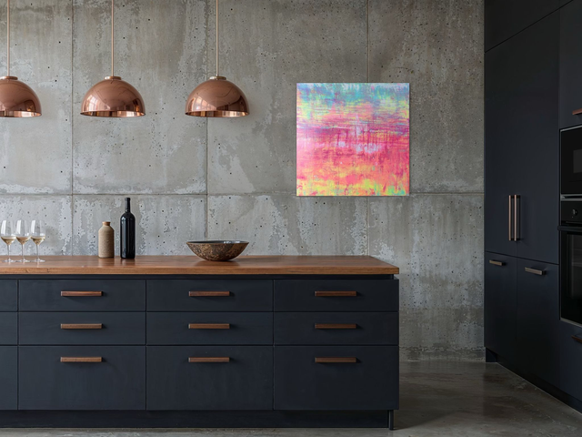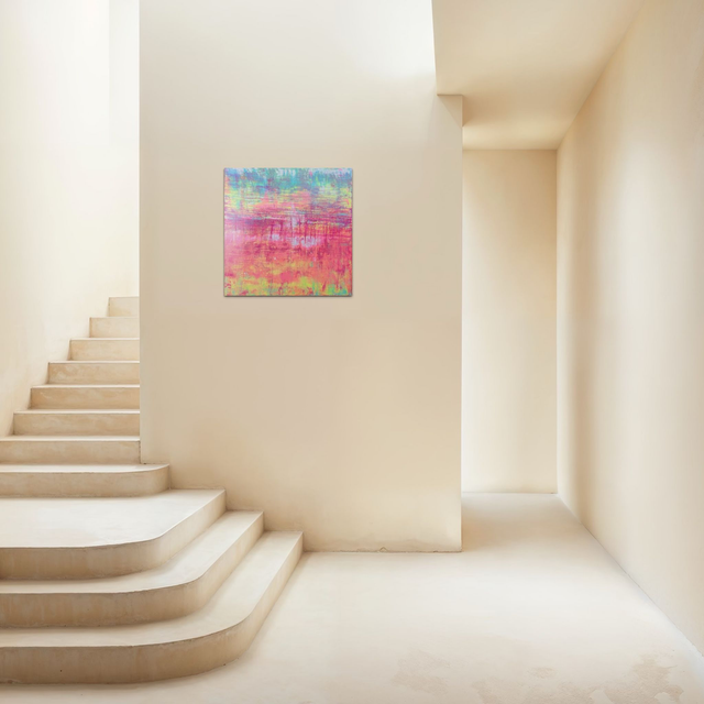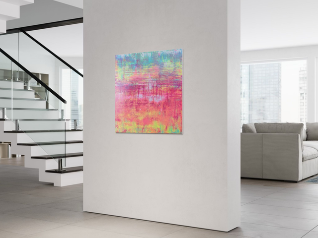 Erleben pure, vitale Energie. Ein explosiver Ausdruck von Licht, Bewegung und emotionaler Tiefe. Dieses expressive Unikat (80x80 cm) ist ein kühnes Statement, das durch seine außergewöhnliche Farbdynamik und haptische Qualität überzeugt. Die intensive Kombination aus Pink, Magenta, Türkis und Limette schafft ein energetisches Zentrum in jedem modernen Interieur. Original. Handsigniert.